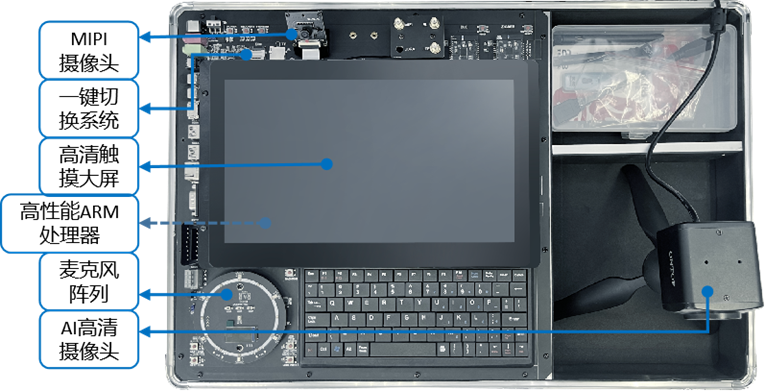 整個(gè)教學(xué)平臺(tái)包括人工智能(AI)和嵌入式Linux部分,兩部分互相支撐、互為補(bǔ)充,共同實(shí)現(xiàn)嵌入式人工智能。人工智能部分的硬件基于嵌入式ARM控制器、高清相機(jī)模塊、7麥麥克風(fēng)陣列,具備語音、圖像數(shù)據(jù)的采集和處理能力及適用于多種場(chǎng)景的控制接口;嵌入式Linux部分的硬件采用CPU+GPU雙處理器架構(gòu),配備高清大屏以及豐富的外設(shè)接口。