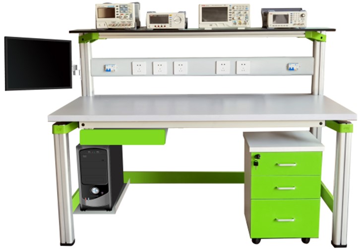 實(shí)驗(yàn)桌后面二支截面尺寸70mm×70mm桌腳向上延伸,與一次成型鋁壓鑄框架連接構(gòu)件構(gòu)成(非焊接工藝)牢固的支架,與儀器架、電源控制箱組成一個(gè)完整的實(shí)訓(xùn)屏。
