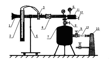 1-入口段 2-U型管壓差計 3-孔板流量計 4-噴管試驗段 5-真空表6-支撐架 7-穩(wěn)壓罐 8、9-調節(jié)閥 10-真空泵  11-探針自動移動機構  12-探針手動移動機構(手槍) 13-橡膠接管