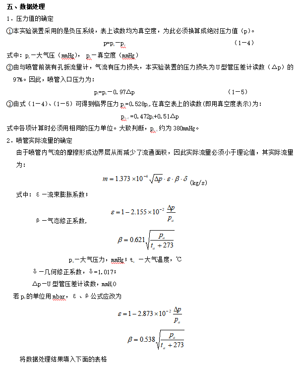 噴管的背壓由固定在排氣管段上的真空表測定,通過噴管的空氣流量則由孔扳流量計及U型管壓差計測定。