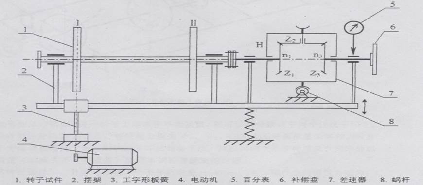 試件的不平衡質(zhì)量的大小和相位可通過安裝在擺架的右端的測量系統(tǒng)獲得,這個測量系統(tǒng)由補償盤6和差速器7組成。差速器的左端為轉(zhuǎn)動輸入端(n1)通過柔性連軸器與試件連接;右端為輸出端(n3)與補償盤相連接。
