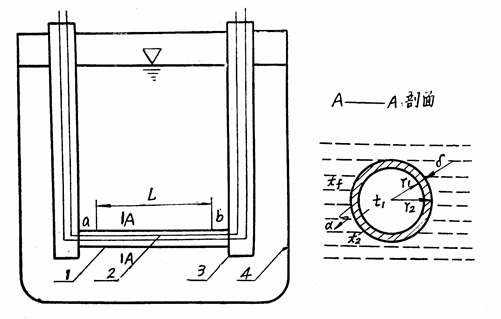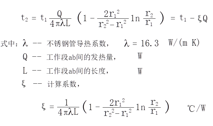 管子的發(fā)熱量電流過(guò)它的電流及其工作段的電壓降來(lái)確定。為排除試件端部的影響,在a、b兩點(diǎn)測(cè)量工作段的電壓降,以確定通過(guò)a、b之間表面的散熱量Q。試件外壁溫度t2,很難直接測(cè)定,對(duì)不銹鋼管試件,可利用插入管內(nèi)的銅——康銅熱電偶2測(cè)出管內(nèi)壁溫度t1,再通過(guò)計(jì)算求出t2。