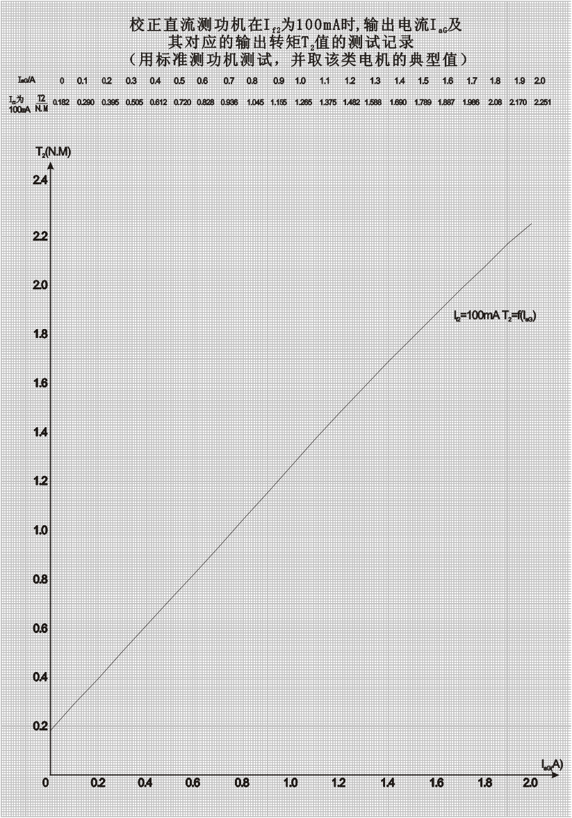 1、IaG-T2曲線是DQ19校正直流測(cè)功機(jī)的勵(lì)磁電流固定在100mA時(shí)利用專用轉(zhuǎn)矩儀校正而來的,用戶在使用過程中,對(duì)應(yīng)于DQ19校正直流測(cè)功機(jī)的勵(lì)磁電流為100mA時(shí)任意電樞電流IaG查找對(duì)應(yīng)的轉(zhuǎn)矩T2即為電動(dòng)機(jī)的輸出轉(zhuǎn)矩。
