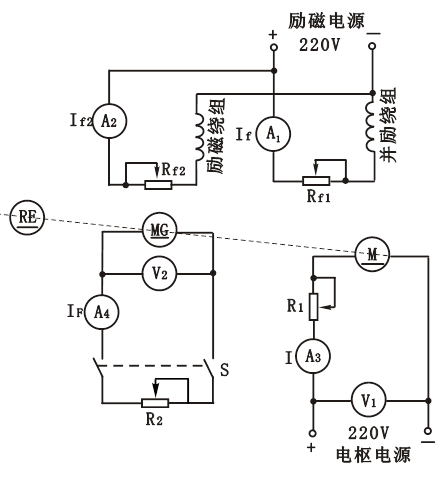 (1)按圖2-4接線。圖中直流他勵(lì)電動(dòng)機(jī)M用DQ09,其額定功率PN=185W,額定電壓UN=220V,額定電流IN=1.1A,額定轉(zhuǎn)速nN=1500r/min,額定勵(lì)磁電流IfN<0.13A。校正直流測功機(jī)MG作為測功機(jī)使用,RE為光電測速系統(tǒng)。直流電流表選用DQ22。Rf1用DQ29的1800Ω阻值作為直流他勵(lì)電動(dòng)機(jī)勵(lì)磁回路串接的電阻。Rf2選用DQ27的1800Ω阻值的變阻器作為MG勵(lì)磁回路串接的電阻。R1選用DQ29的180Ω阻值作為直流他勵(lì)電動(dòng)機(jī)的起動(dòng)電阻,R2選用DQ27上的900Ω串900Ω加上900Ω并900Ω共2250Ω阻值作為MG的負(fù)載電阻。S選用DQ31C。接好線后,檢查M、MG及RE之間是否用聯(lián)軸器直接聯(lián)接好。