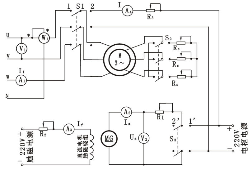 (1)按圖4-2接線,圖中M用編號為DQ11的三相線繞式異步電動機,UN=220V,Y接法。MG用編號為DQ19的校正直流測功機。S1S2、S3選用DQ31C上的對應開關(guān),并將S1合向左邊1端,S2合在左邊短接端(即線繞式電機轉(zhuǎn)子短路),S3合在2'位置。R1選用DQ29180Ω阻值加上DQ27上四只900Ω串聯(lián)再加兩只900Ω并聯(lián)共4230Ω阻值,R2選用DQ291800Ω阻值,RS選用GDQ1235Ω值,R3暫不接。直流電表A2、A4的量程為5A,A3量程為200mA,V2的量程為300V,交流電壓表V1的量程為300VA1量程為3A。