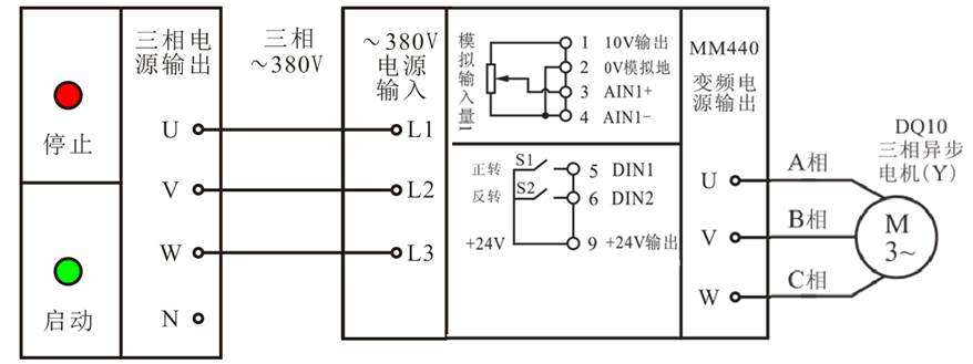 MM440變頻器的“1”、“2”輸出端為用戶(hù)的給定單元提供了一個(gè)高精度的+10V直流穩(wěn)壓電源?衫棉D(zhuǎn)速調(diào)節(jié)電位器串聯(lián)在電路中,調(diào)節(jié)電位器, 改變輸入端口AIN1+給定的模擬輸入電壓,變頻器的輸入量將緊緊跟蹤給定量的變化,從而平滑無(wú)極地調(diào)節(jié)電動(dòng)機(jī)轉(zhuǎn)速的大小。