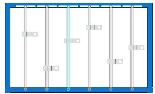 實驗臺機(jī)架如圖2所示:機(jī)架中有5根鉛垂的活塞桿,它們可沿X軸左右移動,固定靠六角頭螺釘和蝶型螺母固定。需移動時請先將蝶型螺母松開,雙手推動活塞桿.并盡可能使它保持垂直狀態(tài);钊麠U上的滑塊可沿Z軸上下移動,用內(nèi)六角螺釘將滑塊緊定在活塞桿上。(注意:在移動立柱或滑塊時需用直尺或卷尺量出它們的相對位置再把螺釘擰緊。)
