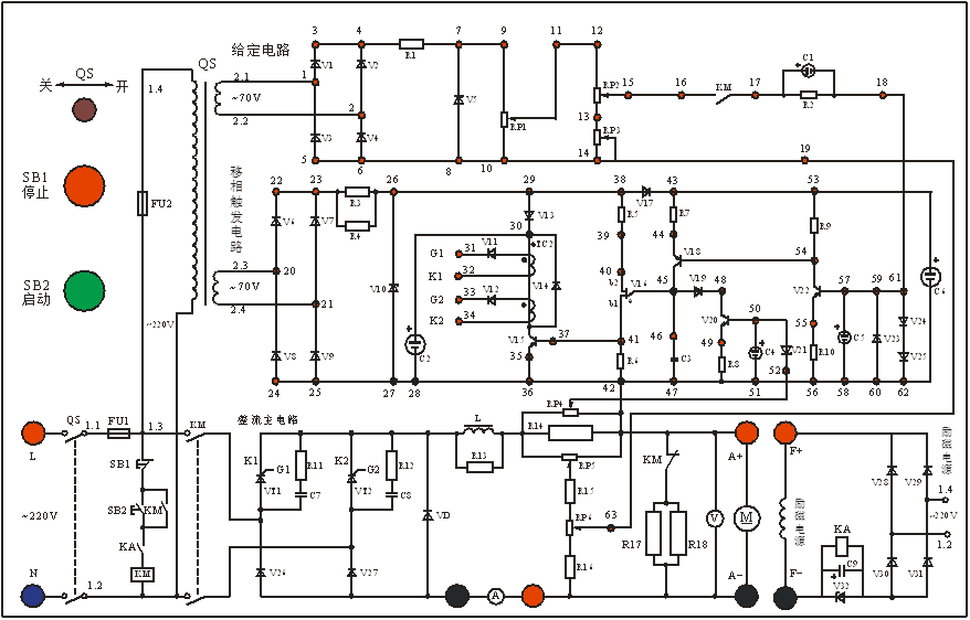 按下SB1(停止按鈕),斷掉晶閘管主電路的電源。在晶閘管主電路中,70、71之間的KM的常閉觸點(diǎn)閉合,電阻R16和R17與電樞并聯(lián)形成能制動(dòng)的回路,加速直流電動(dòng)機(jī)的制動(dòng)。
