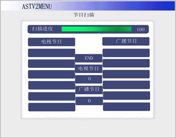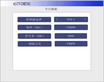 4. 數(shù)字電視射頻接收信號(hào)(MPEG-2 TS流)播放:首先選擇TV欄,按OK鍵進(jìn)入下一級(jí)菜單,如圖1-5,按鍵盤(pán)控制器上的←或→鍵可在射頻源選擇欄上選擇DVB-C(數(shù)字射頻)或者ATV(模擬射頻).首先我們選擇DVB-C.然后我們把頻率、符號(hào)率、調(diào)制方式的參數(shù)設(shè)置成與QAM調(diào)制器一致.確認(rèn)正確后按下OK鍵.此時(shí)系統(tǒng)進(jìn)入節(jié)目掃描菜單,如圖1-6當(dāng)掃描進(jìn)度條掃描到“100”時(shí),再按OK鍵,則可以進(jìn)入播放界面,選擇播放的節(jié)目,按OK播放.此時(shí)觀看LCD屏上所播放的影象。