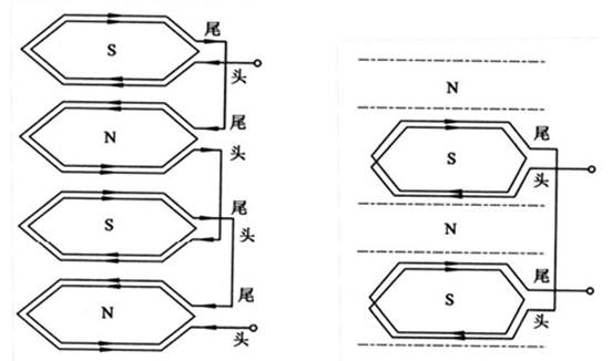 · 極相組的連接。在一個極下的,屬于同一相的所有線圈串聯(lián)在一起,稱為一個極相組。為了保證三相電動機線圈連接之后,能形成 N 極和 S 極相間的排列,各極相組之間的連接,必須是頭頭相拉,如圖 5-1(a)所示。但也有如圖 5-1(b)所示的頭尾相接,這時可以看到,同樣是四極三相電動機,它只有兩個極相組,因而它必須是頭尾相接,才能形成四極的磁場,但此種接法通常用于單繞組多速三相電動機。在中小型電動機中,一個極相組內(nèi)的線圈一般是連續(xù)繞制的,因此不用接頭。(a)頭頭和尾尾相接 (b)頭尾相接