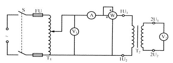 調(diào)壓變壓器一臺,待測變壓器一臺,交流電壓表兩只,交流電流表一只,低功率因數(shù)功率表一只,刀開關(guān)一只,導(dǎo)線若干。