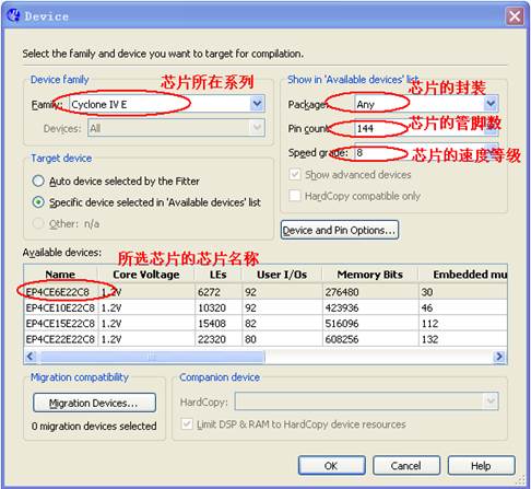 4)點擊NEXT,進(jìn)入下一個設(shè)定對話框,按默認(rèn)選項直接點擊NEXT進(jìn)行器件選擇對話框。如圖1-4所示。這里我們以選用CycloneIV系列芯片EP4CE6E22C8N為例進(jìn)行介紹。用戶可以根據(jù)使用的不同芯片來進(jìn)行設(shè)定。