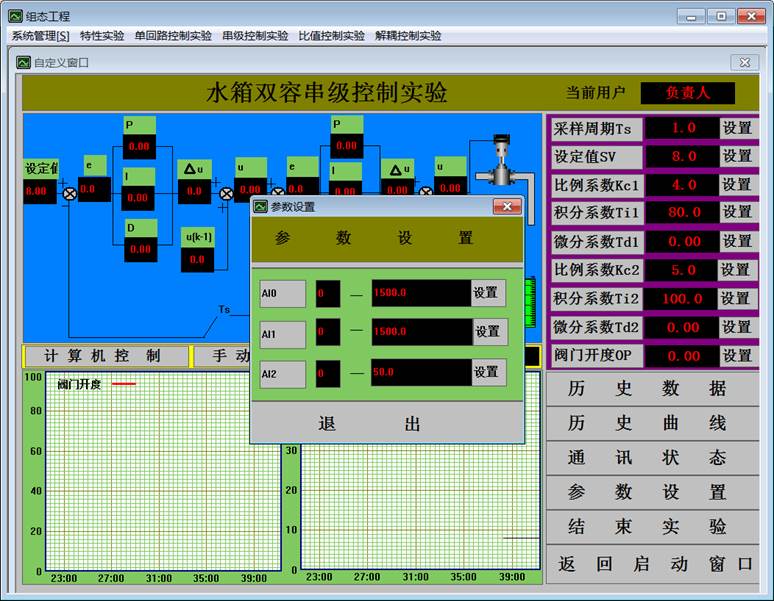9.點擊“確認(rèn)”,用戶登錄完畢。選擇“串級控制實驗”下拉菜單中的“雙容串級控制實驗”。出現(xiàn)如下的“水箱雙容串級控制實驗”界面。