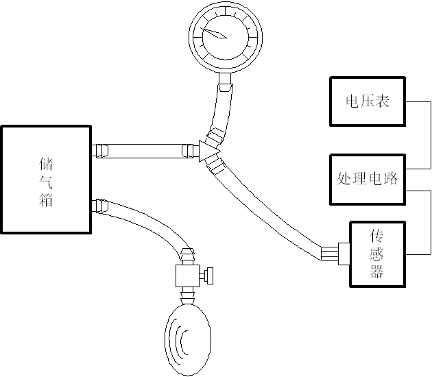 壓阻式壓力傳感器、壓阻式壓力傳感器轉(zhuǎn)換電路板、橡皮氣囊、儲(chǔ)氣箱、三通連接導(dǎo)管、壓力表、位移臺(tái)架、直流穩(wěn)壓電源、數(shù)字電壓表