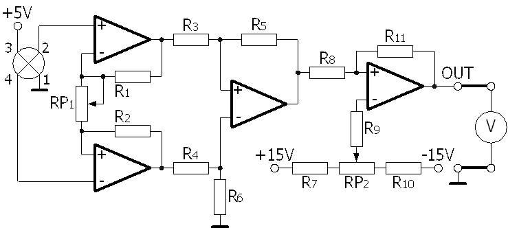 擴(kuò)散硅式壓阻式壓力傳感器,在單晶硅的基片擴(kuò)散出P型或N型電阻條,接成電橋。在壓力作用下根據(jù)半導(dǎo)體的壓阻效應(yīng),基片產(chǎn)生應(yīng)力,電阻條的電阻率產(chǎn)生變化,引起電阻的變化,將這一變化引入測(cè)量電路,通過(guò)輸出電壓可以測(cè)量出其所受的壓力大小。測(cè)量電路圖39-1所示,其中RP1用于調(diào)節(jié)放大倍數(shù),RP2用于調(diào)節(jié)零點(diǎn)。