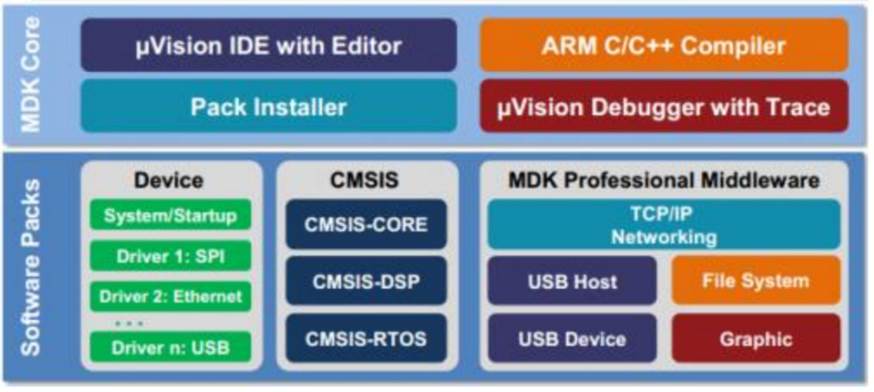 MDK 源自德國的 KEIL 公司,是 RealView MDK 的簡稱。在全球 MDK 被超過 10 萬的嵌入式開發(fā)工程師使用。目前最新版本為:MDK5.14,該版本使用 uVision5 IDE 集成開發(fā)環(huán)境,是目前針對 ARM 處理器,尤其是 Cortex M 內(nèi)核處理器的最佳開發(fā)工具。MDK5 向后兼容 MDK4 和 MDK3 等,以前的項(xiàng)目同樣可以在 MDK5 上進(jìn)行開發(fā)(但是頭文件方面得全部自己添加), MDK5 同時加強(qiáng)了針對 Cortex-M 微控制器開發(fā)的支持,并且對傳統(tǒng)的開發(fā)模式和界面進(jìn)行升級,MDK5 由兩個部分組成:MDK Core 和 Software Packs。其中,Software Packs 可以獨(dú)立于工具鏈進(jìn)行新芯片支持和中間庫的升級。如下圖所示。