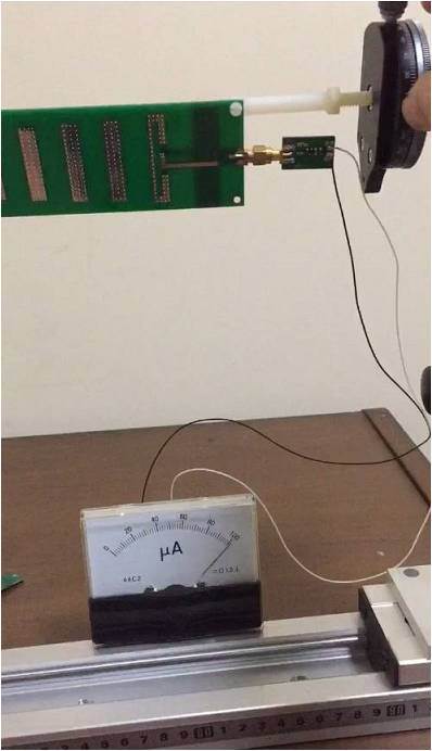 5、用云臺(tái)轉(zhuǎn)盤將振子接收天線從水平方向旋轉(zhuǎn)5°到偏離水平方向5°。將旋轉(zhuǎn)云臺(tái)轉(zhuǎn)盤的手移開,盡量保持在采第一個(gè)點(diǎn)時(shí)的環(huán)境狀態(tài),減少環(huán)境對(duì)實(shí)驗(yàn)的干擾。獲取振子天線偏離水平方向5°時(shí),振子接收天線接收到的微安表強(qiáng)度,