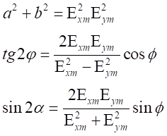 除了用 Exm和Eym及f來(lái)描述波的極化以外,還可以用極化橢圓的長(zhǎng)軸a,短軸b和傾角j(橢圓長(zhǎng)軸與X軸的夾角)來(lái)描述當(dāng)a¹b時(shí)為橢圓極化,a=b時(shí)為圓極化,而a=0或b=0時(shí)為線極化。如果在垂直于波傳播方向的平面上,用兩個(gè)相互垂直放置的線極化天線,測(cè)量波的Exm, Eym;或者用一個(gè)線極化天線從零到360°旋轉(zhuǎn),測(cè)量出a,b和j,便可確定波的極化狀態(tài)。因此,Exm,Eym和f以及a、b和 j可取作描述波的極化狀態(tài)的兩組參數(shù)。可以證明,兩組參數(shù)間有如下關(guān)系: