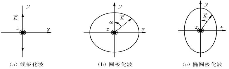 如果在一個(gè)確定的空間點(diǎn)上觀察平面電磁波的場(chǎng)矢量,則可發(fā)現(xiàn)場(chǎng)矢量的空間取向一般是隨時(shí)間變化的。為了描述場(chǎng)矢量的空間取向隨時(shí)間變化的規(guī)律,引進(jìn)了平面電磁波的極化概念,此處所謂極化也叫偏振,是指空間任一固定點(diǎn)上波的電場(chǎng)矢量的空間取向隨時(shí)間變化的方式,可用的矢端軌跡來(lái)描述。如果的矢端軌跡為直線,波為線極化,的矢端軌跡為圓,波為圓極化;矢端軌跡為橢圓,波為橢圓極化。顯然,對(duì)于均勻平面波來(lái)說(shuō),空間所有點(diǎn)上,波的極化狀態(tài)都是相同的。無(wú)界媒質(zhì)中均勻平面波是TEM。TEM波的電場(chǎng)和磁場(chǎng)矢量均在垂直于傳播方向的平面內(nèi)。設(shè)波沿z方向傳播,則均在z=常數(shù)的平面內(nèi)。但在此平面內(nèi)的取向可以是任意的,或者是隨時(shí)間變化的,因?yàn)椋瑢?duì)任意取定的坐標(biāo)系,一般有兩個(gè)分量:
