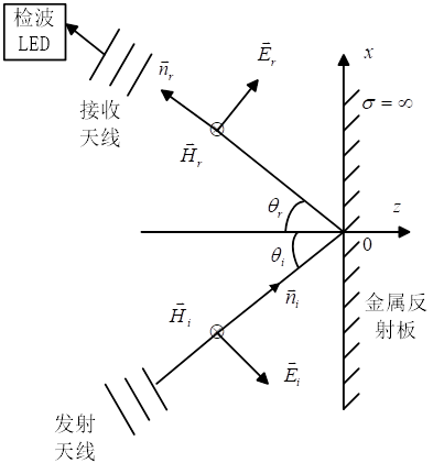 1)垂直或水平極化波斜入射到導(dǎo)體平面的反射波;沿反射角方向LED最亮。