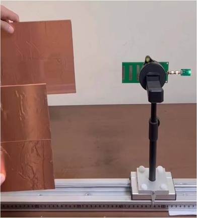 4、移動(dòng)反射板,觀察LED燈是否有明暗的變化,如果不亮可以將接收天線向發(fā)射天線移動(dòng),可以測(cè)試不同顏色的LED燈被點(diǎn)亮的距離。