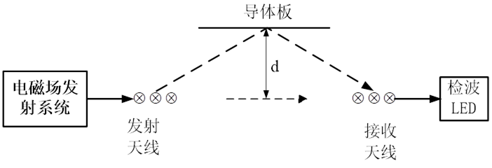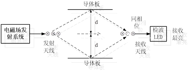 當(dāng)用直射線和兩條反射線疊加相位相等時(shí)LED最亮,相位相反時(shí),接收電磁波抵消LED不亮。移動(dòng)距離中軸線的距離d,接收LED時(shí)滅時(shí)亮,某一個(gè)位置時(shí)達(dá)到最亮。記錄下距離中軸線的距離d,計(jì)算直射線和反射線的距離差值。反射線經(jīng)過導(dǎo)體板反射時(shí)有180度的相位差。