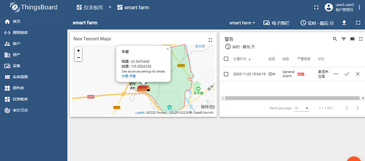 圖:智慧牧場課程案例,使用GPS對奶牛位置進行定位,通過LoRa網(wǎng)絡將位置信息上報,使用ThingsBoard平臺的電子圍欄工具結合騰訊地圖,實現(xiàn)奶牛越過電子圍欄時發(fā)送警報提醒。