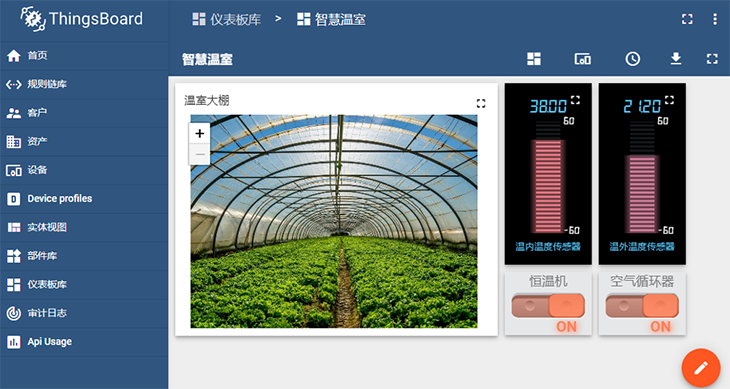 圖:智慧溫室課程案例,使用ThingsBoard云平臺的儀表板,對感知層設備上送的溫室環(huán)境數(shù)據(jù)與設備狀態(tài)進行展示。