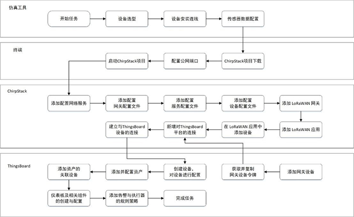 模擬智慧牧場系統(tǒng)還引入使用開源軟件平臺ChirpStack與ThingsBoard,結合LPWAN技術,實現(xiàn)遠程低功耗數(shù)據(jù)采集、上報和展示。在ChirpStack平臺上,用戶可對網(wǎng)關、GPS、溫濕度傳感器等設備進行配置,以上送仿真實驗中的虛擬數(shù)據(jù)。在ThingsBoard平臺上,設置牧場地圖、告警信息、溫濕度等各儀表盤組件;獲取仿真設備上送的數(shù)據(jù),并將數(shù)據(jù)以圖表形式作可視化呈現(xiàn);以及基于流式編程添加相應的規(guī)則策略,最終完成模擬智慧牧場實訓場景的部署搭建。