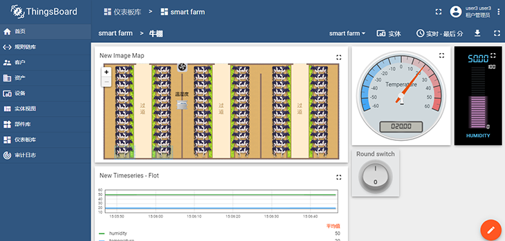 圖:智慧牧場課程案例,在牛棚內安裝溫濕度傳感器和排風扇,在ThingsBoard云平臺上制定規(guī)則策略,當棚內溫度過高時自動開啟排風扇對牛棚進行降溫,以保障奶牛養(yǎng)殖環(huán)境處在適宜的溫度下。