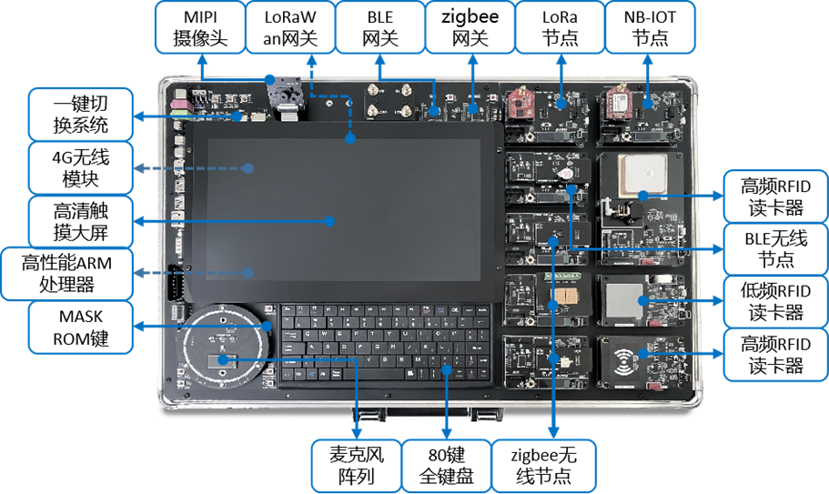 整個(gè)教學(xué)平臺(tái)包括物聯(lián)網(wǎng)、嵌入式Linux和人工智能(AI),三個(gè)部分互相支撐、互為補(bǔ)充。人工智能部分的硬件基于嵌入式ARM控制器、高清相機(jī)模塊、7麥麥克風(fēng)陣列,具備語音、圖像數(shù)據(jù)的采集和處理能力及適用于多種場(chǎng)景的控制接口;嵌入式Linux部分的硬件采用CPU+GPU雙處理器架構(gòu),配備高清大屏以及豐富的外設(shè)接口;物聯(lián)網(wǎng)部分的硬件支持RFID、Zigbee、Ble、Lora、NBIoT等無線傳輸技術(shù)以及20余種傳感器模塊。