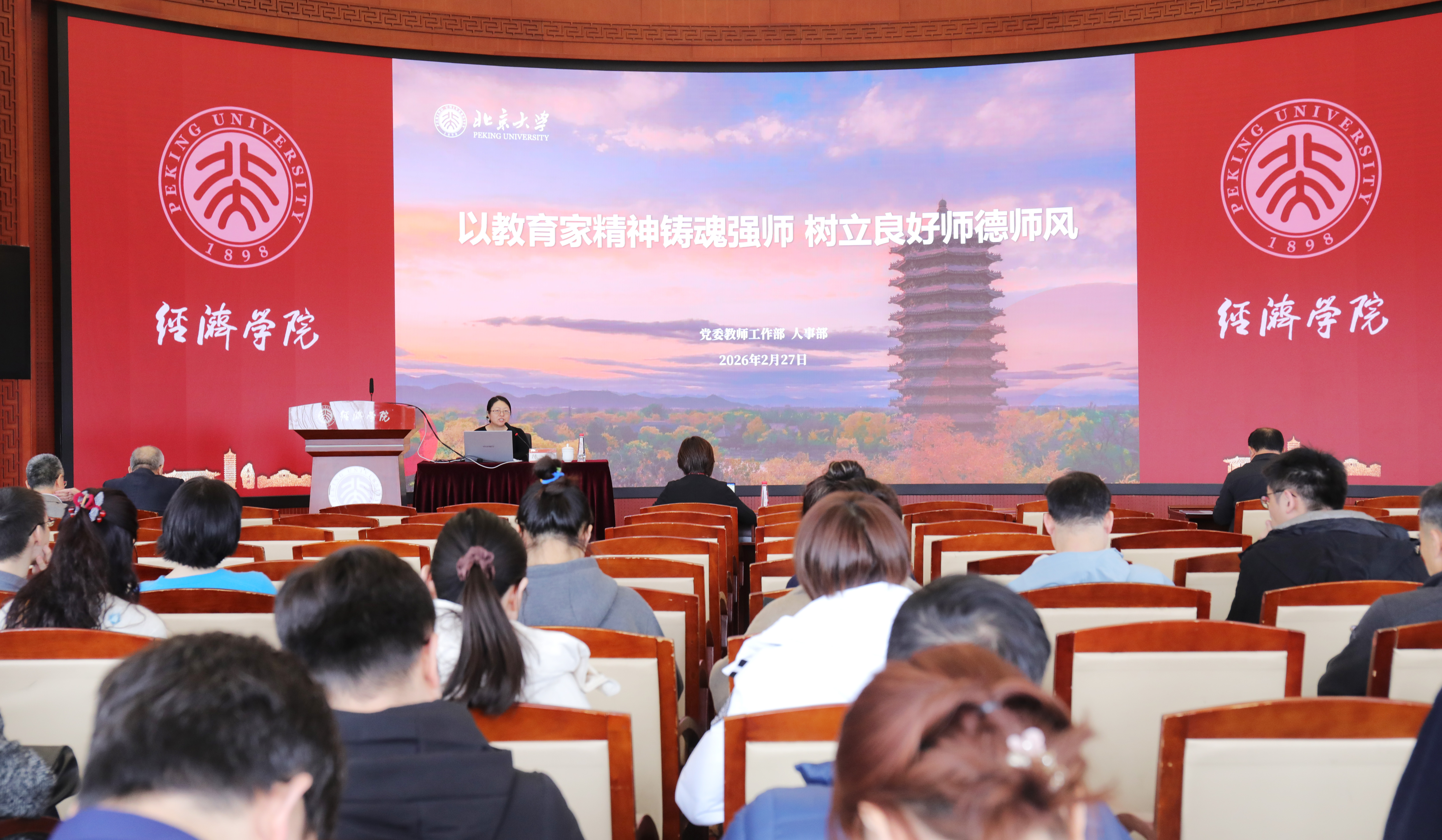 2026年2月27日下午,北京大學(xué)經(jīng)濟(jì)學(xué)院在學(xué)院603報(bào)告廳舉辦2026年春季學(xué)期第一次教職工大會(huì)暨師德師風(fēng)專(zhuān)題教育培訓(xùn)會(huì)。本次會(huì)議旨在深入學(xué)習(xí)貫徹習(xí)近平總書(shū)記關(guān)于教育的重要論述,全面落實(shí)立德樹(shù)人根本任務(wù),進(jìn)一步加強(qiáng)新形勢(shì)下高素質(zhì)、專(zhuān)業(yè)化教師隊(duì)伍建設(shè)。會(huì)議邀請(qǐng)北京大學(xué)黨委教師工作部副部長(zhǎng)陳默作為主講嘉賓,為經(jīng)濟(jì)學(xué)院全體教職工、博士后等150余人授課。會(huì)議由經(jīng)濟(jì)學(xué)院黨委副書(shū)記宋芳秀主持。