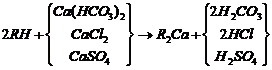 當(dāng)含有鈣鹽及鎂鹽的水通過裝有陽離子交換樹脂的交換器時(shí),水中的Ca2+及Mg2+便與樹脂中的可交換離子(Na+或H+)交換,使水中Ca2+、 Mg2+含量降低或基本上全部去除,這個(gè)過程叫做水的軟化。樹脂失效后要進(jìn)行再生,即把樹脂上吸附的鈣、鎂離子置換出來,代之以新的可交換離子。鈉離子交換用食鹽(NaCl)再生、氫離子交換用鹽酸(HCl)或硫酸(H2SO4)再生;痉磻(yīng)式如下。