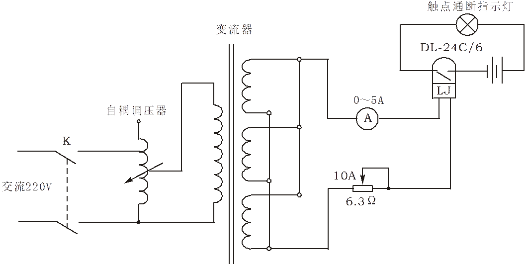 c、按圖1--4接線,檢查無誤后,調(diào)節(jié)自耦調(diào)壓器及變阻器,增大輸出電流,使繼電器動作。讀取能使繼電器動作的最小電流值,即使常開觸點由斷開變成閉合的最小電流,記入表1-2;動作電流用Idj表示。繼電器動作后,反向調(diào)節(jié)自耦調(diào)壓器及變阻器降低輸出電流,使觸點開始返回至原來位置時的最大電流稱為返回電流,用Ifj表示,讀取此值并記入表1--2,并計算返回系數(shù);繼電器的返回系數(shù)是返回電流與動作電流的比值,用Kf 表示。