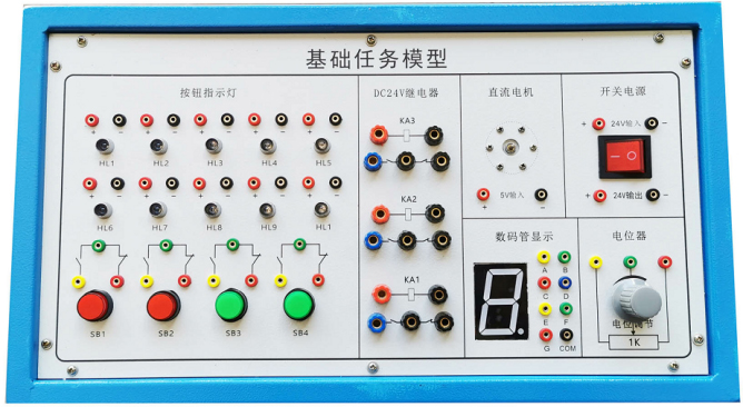 該任務(wù)盒有1.2mm優(yōu)質(zhì)鋼板加工噴涂制作,面板有鋁板加工沖孔而成,表面貼膜制作,配置有直流電機(jī)、7段數(shù)碼管、彩燈組、繼電器組、按鈕組、電位器等,能滿足對(duì)PLC教學(xué)基礎(chǔ)任務(wù)指令的學(xué)習(xí)與應(yīng)用。