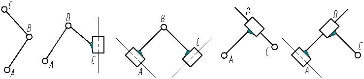 最簡單的桿組為n = 2, P5 = 3,稱為Ⅱ級(jí)組,由于桿組中轉(zhuǎn)動(dòng)副和移動(dòng)副的配置不同,Ⅱ級(jí)桿組共有如下五種形式: