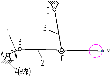 構(gòu)件1繞A點順時針方向轉(zhuǎn)動時,構(gòu)件2上M點以逆時針方向轉(zhuǎn)動,其軌跡為近似圓形。