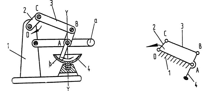 圖1-2a所示為攪拌機(jī)Ⅱ的結(jié)構(gòu)示意圖,1-2b是攪拌機(jī)構(gòu)的運(yùn)動簡圖。鉸鏈四桿機(jī)構(gòu)DCBA的搖桿4繞軸線A轉(zhuǎn)動,搖桿4既為漿葉。軸線A實際上是搖桿4與機(jī)架1形成的轉(zhuǎn)動副。重物a用以漿液壓向碗底。在曲柄2轉(zhuǎn)動時,漿液4沿碗底b滑動;碗底做成中心在A點的球形表面。碗繞鉛垂軸線Y-Y轉(zhuǎn)動,其傳動裝置在圖中未畫出。
