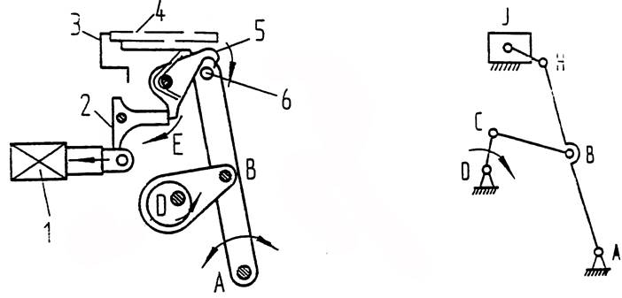 機(jī)構(gòu)說明:圖1-1所示為卡片穿孔機(jī)的送卡片機(jī)構(gòu),圖1-2是其送卡片時的機(jī)構(gòu)運(yùn)動簡圖。根據(jù)螺線管1的輸入信號,向左拉動棘爪2時,E部松開,棘爪5落下卡住軸6組成轉(zhuǎn)動副。于是,偏心軸的運(yùn)動得以傳遞給滑座3,將卡片4送出。偏心軸一直不動,只有當(dāng)軸6被棘爪鉤住時,才能移送卡片。