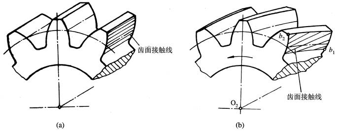 直齒圓柱齒輪嚙合時(shí),輪齒接觸線是一條平行于軸線的直線,并沿齒面移動(dòng),如圖4-1(a)所示。 所以在傳動(dòng)過(guò)程中,兩輪齒將沿著整個(gè)齒寬同時(shí)進(jìn)入嚙合或同時(shí)退出嚙合,因而輪齒上所受載荷也是突然加上或突然卸下, 傳動(dòng)平穩(wěn)性差,易產(chǎn)生沖擊和噪聲。 