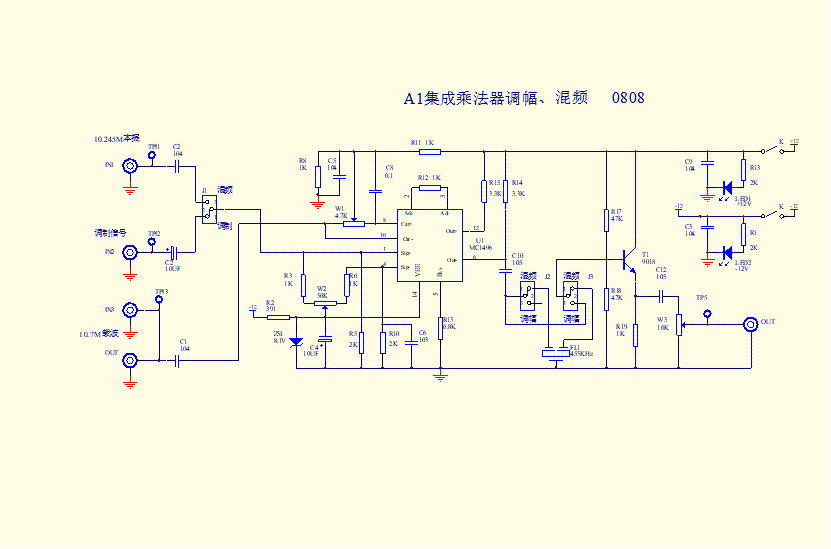 在IN3端加入載波信號,(IN2調(diào)制信號暫不加),TPI3點監(jiān)測幅度。調(diào)節(jié)W2使OUT端輸出電壓幅度最小。在IN2端加入調(diào)制信號,(載波信號暫不加),TPI2點監(jiān)測幅度。調(diào)節(jié)W1使輸出電壓幅度最小。反復進行上述調(diào)整,使OUT端輸出電壓幅度達到最小。