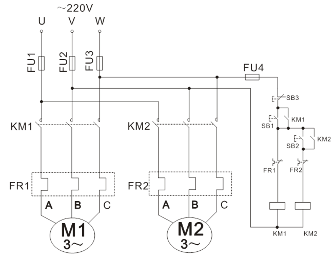 (4)在M1與M2都運行時,單獨按下SB1,觀察并記錄電機及接觸器運行狀態(tài)。