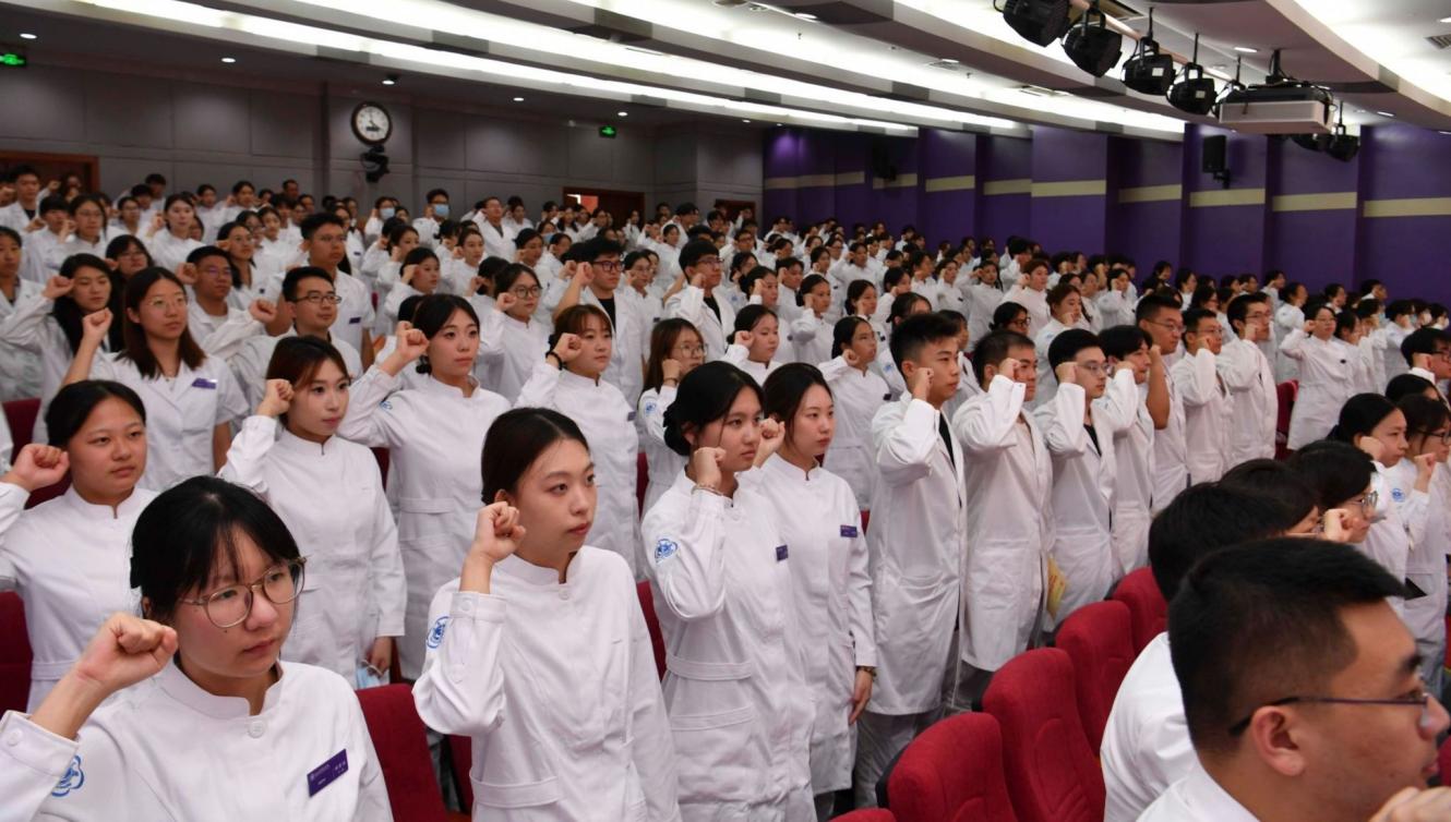 全體新職工肅然起立,高舉右拳,在李蓉的領(lǐng)誓下重溫神圣的醫(yī)學(xué)生誓言。