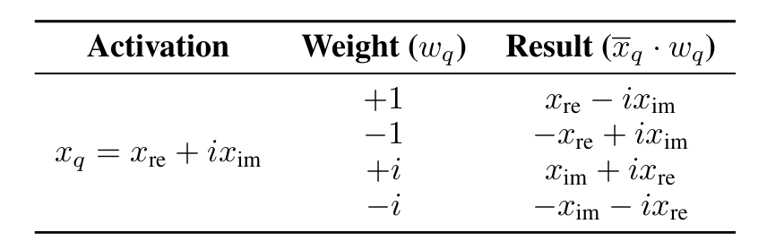 研究聚焦于大語(yǔ)言模型在真實(shí)應(yīng)用中的空間和時(shí)間瓶頸。傳統(tǒng)全精度模型參數(shù)量大、推理能耗高;盡管已有低比特量化降低了模型體積,但核心矩陣乘法仍廣泛依賴乘法運(yùn)算,難以從根本上壓縮推理時(shí)延和能耗。為此,團(tuán)隊(duì)提出在復(fù)數(shù)平面進(jìn)行2-bit量化:通過(guò)相位映射將權(quán)重限定為四個(gè)單位根{+1, −1, +i, −i},在不增加位寬的情況下充分利用2 bit信息容量,同時(shí)保持量化集合的對(duì)稱性和訓(xùn)練穩(wěn)定性。