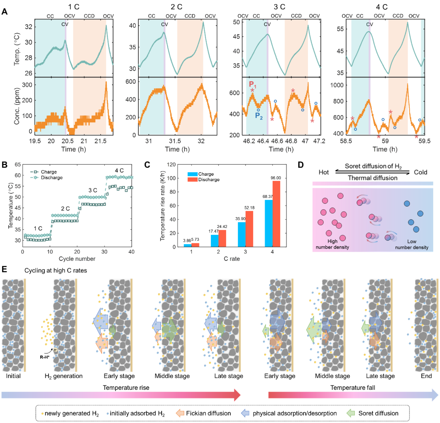 為此,進(jìn)一步建立了一個(gè)描述電池內(nèi)部氫氣瞬態(tài)與空間演化的理論模型,涵蓋吸附/脫附、Fick擴(kuò)散、Soret擴(kuò)散及化學(xué)反應(yīng)等多種機(jī)制,系統(tǒng)解釋了該NTC行為,認(rèn)為其源于在高焦耳熱效應(yīng)與電池系統(tǒng)低Lewis數(shù)條件下,H2的Soret擴(kuò)散增強(qiáng)所致(圖4)。
