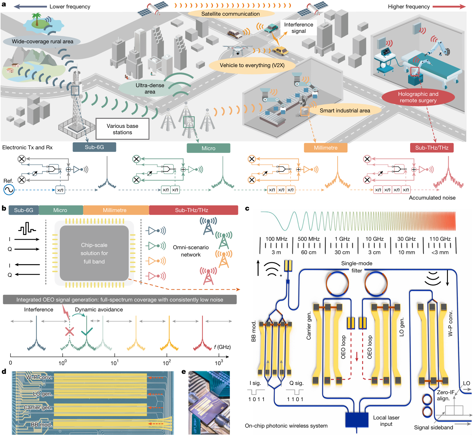 為滿足日益增長(zhǎng)的泛在接入需求,未來(lái)下一代無(wú)線通信網(wǎng)絡(luò)將動(dòng)態(tài)實(shí)時(shí)利用全頻譜資源來(lái)支持多樣化應(yīng)用場(chǎng)景(圖1a)。例如,高頻毫米波和太赫茲波段將提供更高的數(shù)據(jù)速率和更低的時(shí)延,從而支持?jǐn)U展現(xiàn)實(shí)(XR)、遠(yuǎn)程手術(shù)等新興數(shù)據(jù)密集型業(yè)務(wù);而低傳播損耗的Sub-6 GHz、微波等波段則繼續(xù)為城市或偏遠(yuǎn)區(qū)域提供廣域覆蓋。此外,系統(tǒng)還需具備實(shí)時(shí)頻譜重構(gòu)能力,以確保在復(fù)雜頻譜環(huán)境中的高效利用和穩(wěn)定連接。為實(shí)現(xiàn)這種自適應(yīng)全頻段靈活無(wú)線通信的愿景,亟須一種通用型硬件解決方案,以兼容全頻段無(wú)線信號(hào),并滿足小型化/輕量化集成和低功耗運(yùn)行的需求。然而,傳統(tǒng)電子學(xué)硬件僅可工作在單個(gè)頻段,不同頻段的器件依賴不同的設(shè)計(jì)規(guī)則、結(jié)構(gòu)方案和材料體系,難以實(shí)現(xiàn)跨頻段乃至全頻段范圍的工作。