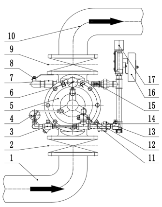 1.供水側(cè);2.消防信號(hào)蝶閥(常開);3.復(fù)位球閥(常閉);4.供水側(cè)壓力表;5.閥組;6.系統(tǒng)側(cè)壓力表;7.自動(dòng)排水閥;8.放水球閥(常閉);9.消防信號(hào)蝶閥(常開);10.系統(tǒng)側(cè);11.防復(fù)位閥;12.警鈴試驗(yàn)球閥(常閉);13.消防電磁閥;14.緊急手動(dòng)球閥(常閉);15.報(bào)警控制球閥(常開);16.水力警鈴;17.壓力開關(guān)