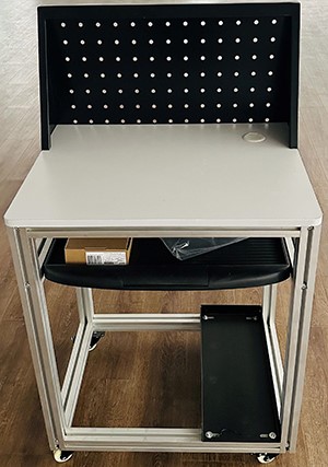 鋼鋁結(jié)構(gòu),裝有4只萬向輪,裝有黑色鋼質(zhì)網(wǎng)孔電腦后靠、鍵盤托、主機支架。![]() |
